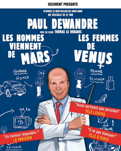 Après plus de 1000 représentations à travers la France, la Belgique, la Suisse et le Luxembourg, PAUL DEWANDRE revient près de chez vous avec son spectacle au succès interplanétaire ! Le comédien nous rappelle les différences entre les hommes et les femmes, et cela ne se fait pas sans humour ! Dans le public, les femmes éclatent de rire, poussent du coude leurs voisins et les hommes se font des clins d’œil en douce… On en sort avec une bonne dose de fous rire et la volonté de vivre en harmonie avec sa ou son partenaire.